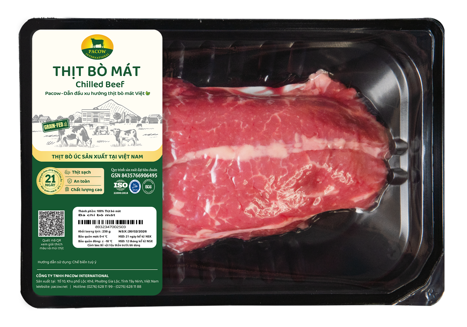 Bao bì được đóng gói hút chân không theo công nghệ tiên tiến với 2 lớp màng bảo vệ (giúp tách oxi ra khỏi sản phẩm nhằm ngăn chặn sự phát triển của các vi sinh vật), giúp thịt được bảo quản lên đến 21 ngày (ở nhiệt độ 0-4 độ C).