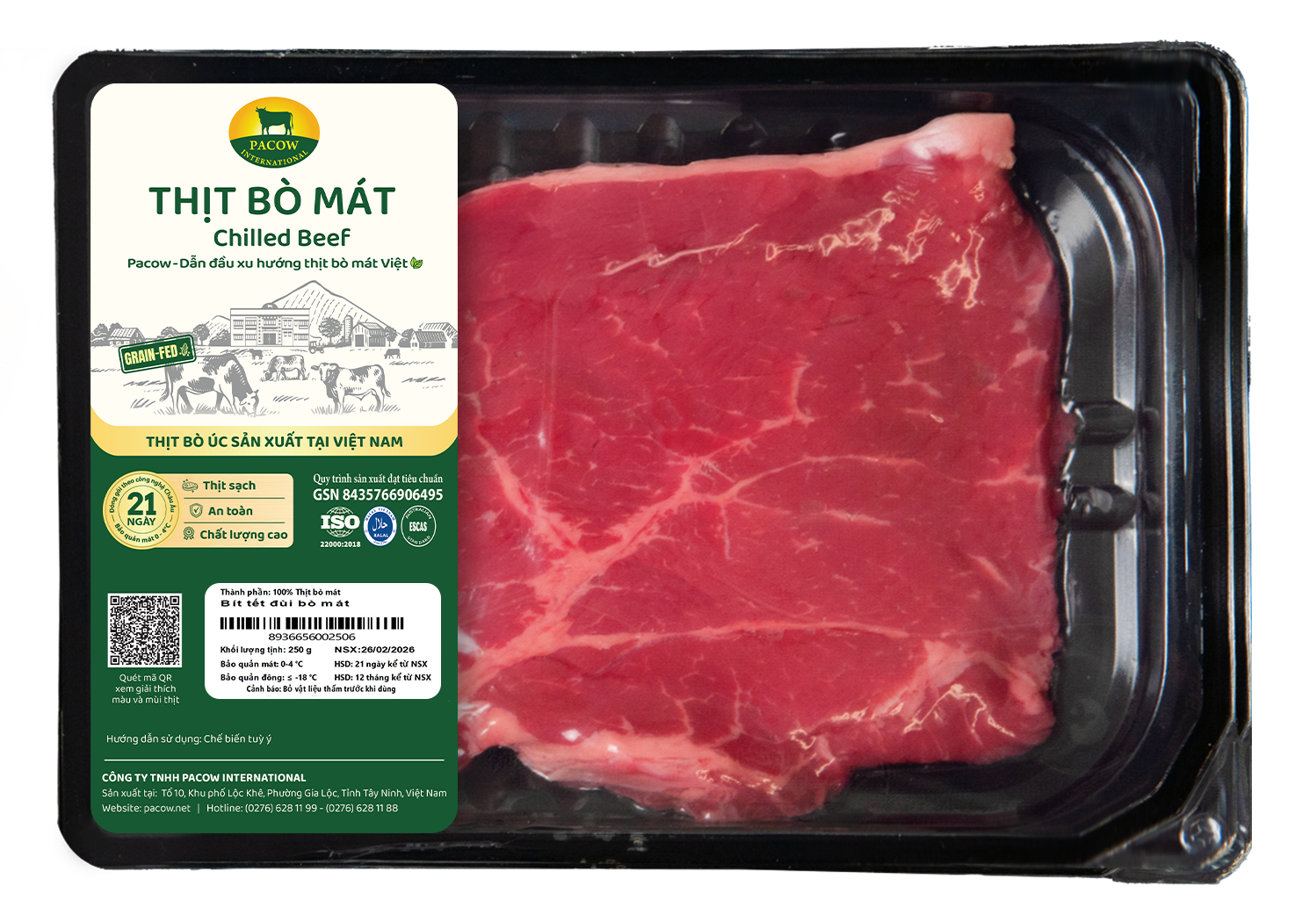 Bao bì được đóng gói hút chân không theo công nghệ tiên tiến với 2 lớp màng bảo vệ (giúp tách oxi ra khỏi sản phẩm nhằm ngăn chặn sự phát triển của các vi sinh vật), giúp thịt được bảo quản lên đến 21 ngày (ở nhiệt độ 0-4 độ C).