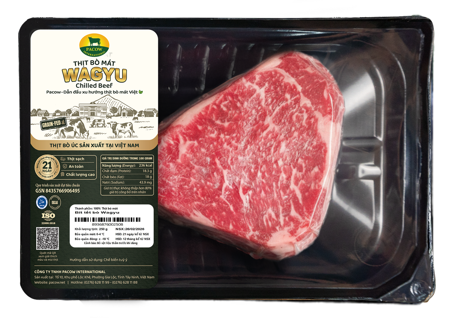 - Bao bì hút chân không, giúp bảo vệ thịt bò Wagyu tươi ngon bổ dưỡng trong suốt 21 ngày (ở nhiệt độ mát từ 0-4 độ C). Bảo quản đông ≤ -18 độ C.
