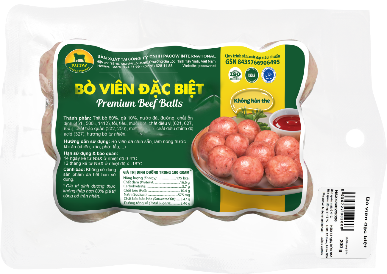 BÒ VIÊN ĐẶC BIỆT PACOW 200G được sản xuất từ thịt bò (80%), thịt gà (10%) (ở các sản phẩm bò viên thông thường, tỉ lệ thịt bò chỉ chiếm 35-45%).