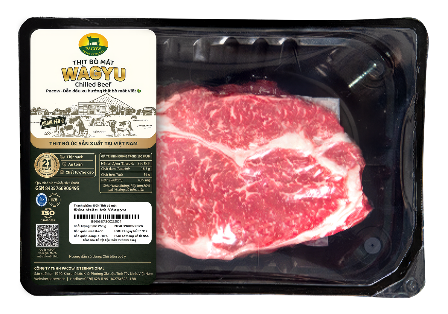 - Bao bì hút chân không, giúp bảo vệ thịt bò Wagyu tươi ngon bổ dưỡng trong suốt 21 ngày (ở nhiệt độ mát từ 0-4 độ C). Bảo quản đông ≤ -18 độ C.