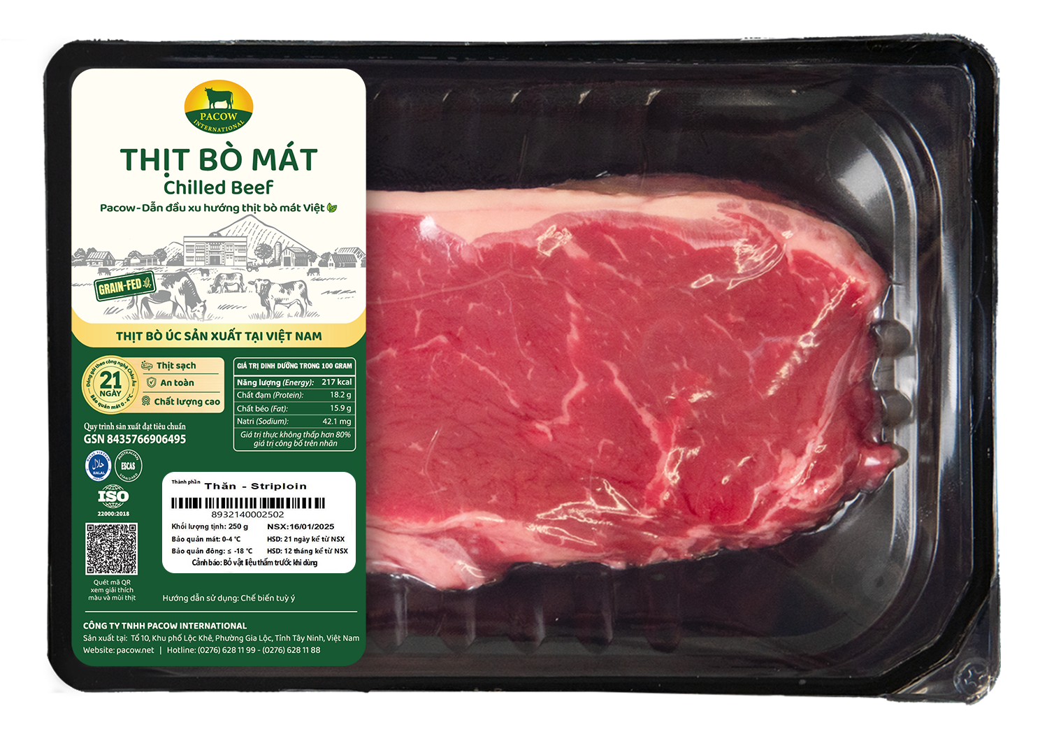 Bao bì được đóng gói hút chân không theo công nghệ tiên tiến với 2 lớp màng bảo vệ (giúp tách oxi ra khỏi sản phẩm nhằm ngăn chặn sự phát triển của các vi sinh vật), giúp thịt được bảo quản lên đến 21 ngày (ở nhiệt độ 0-4 độ C).