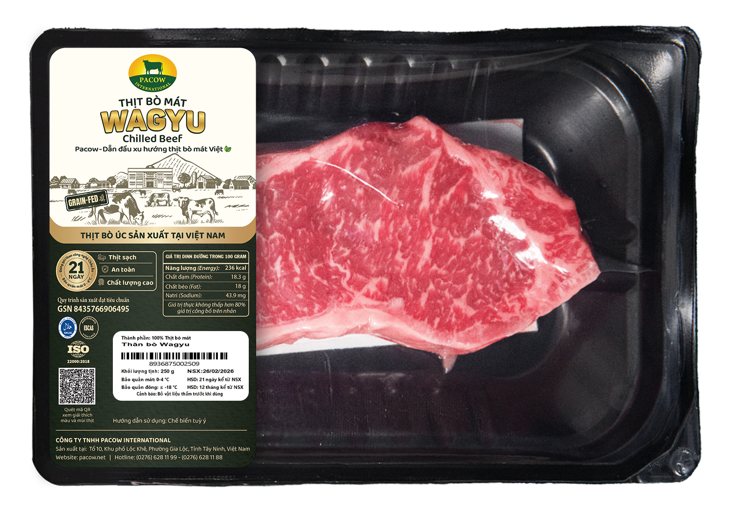 - Thịt bò mát Pacow được sản xuất theo quy trình khép kín từ nông trại tới bàn ăn (khu chăn nuôi, giết mổ và nhà máy tại Tây Ninh).