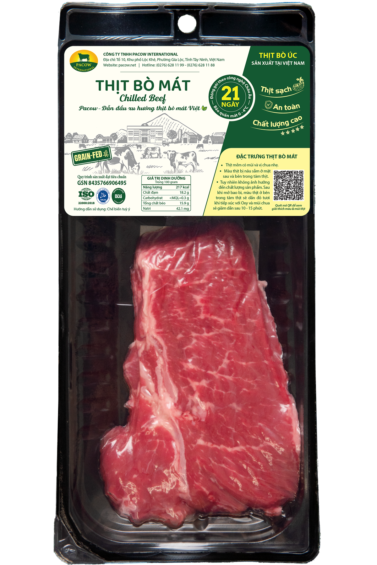 Bao bì được đóng gói hút chân không theo công nghệ tiên tiến với 2 lớp màng bảo vệ (giúp tách oxi ra khỏi sản phẩm nhằm ngăn chặn sự phát triển của các vi sinh vật), giúp thịt được bảo quản lên đến 21 ngày (ở nhiệt độ 0-4 độ C).